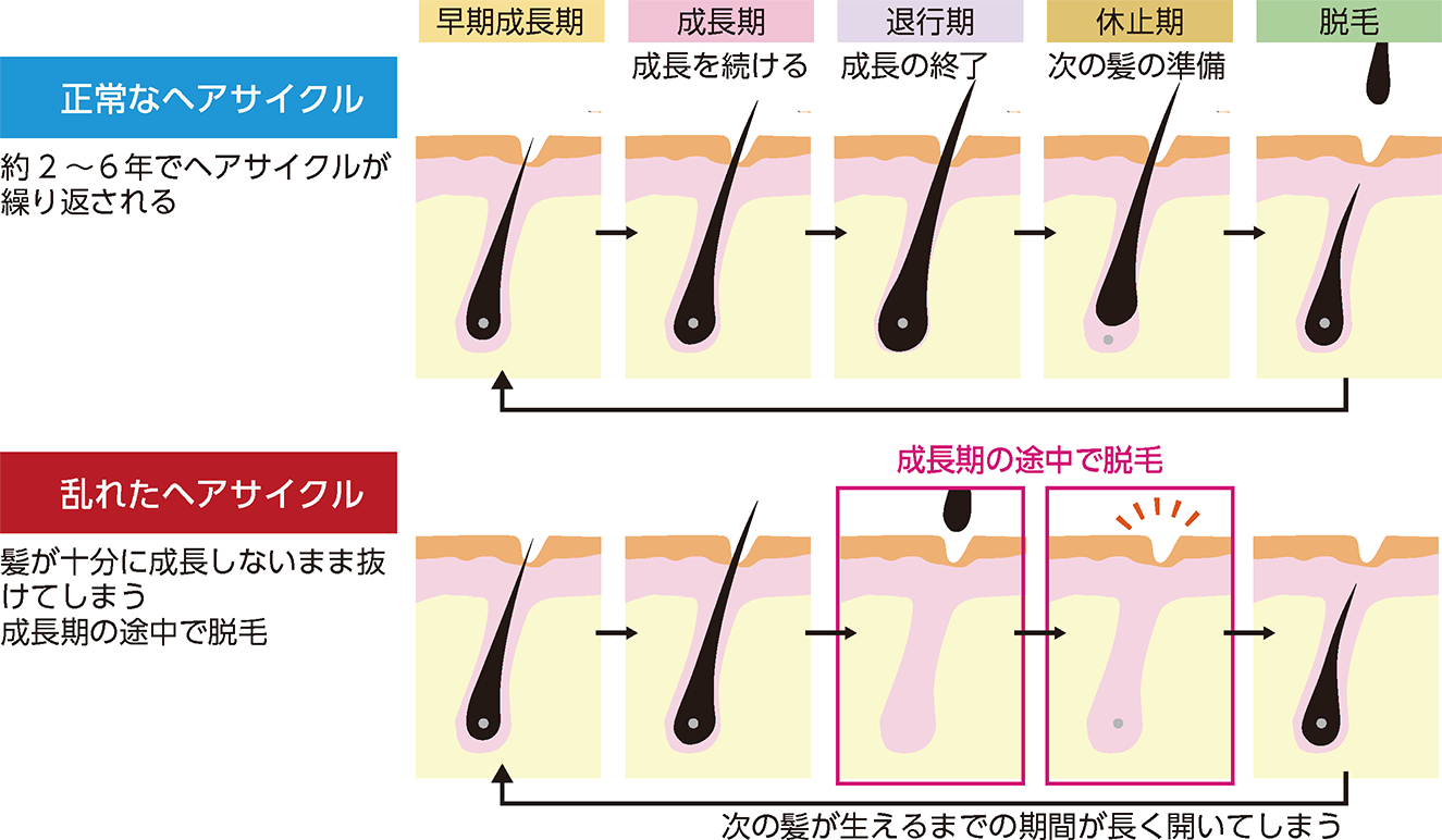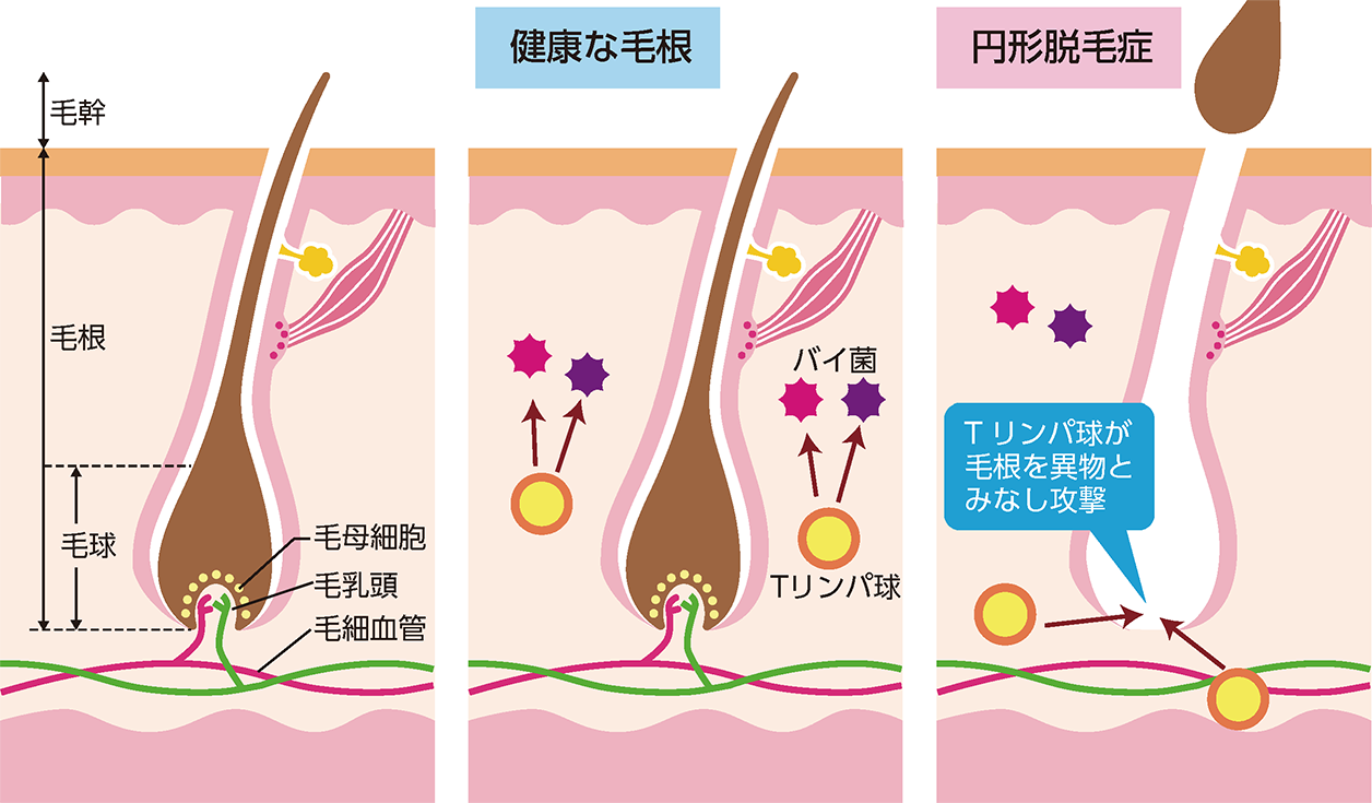 何らかのきっかけによって本来、病原体と戦う働き(免疫)が自分自身の体に向いてしまう病気を自己免疫疾患と呼びます。円形脱毛症は、毛を作る毛包(もうほう)周囲に炎症が起こり、一部のリンパ球が毛包の組織を壊そうとする自己免疫反応によって、毛が抜ける病気です(図2)。