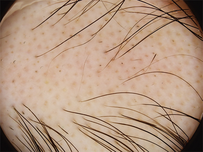 境界が明瞭な脱毛斑が見られる場合には、診断に苦労しません。しかしながら脱毛症には、男性型脱毛症、トリコチロマニア(抜毛症)、休止期脱毛症、先天性脱毛症、瘢痕性(はんこんせい)脱毛症など、さまざまな病気があるため、専門医による診察が必要です。これらの疾患は、ダーモスコピーという特殊な拡大鏡を用いて頭皮や頭髪の状態を確認することで診断が可能となります。