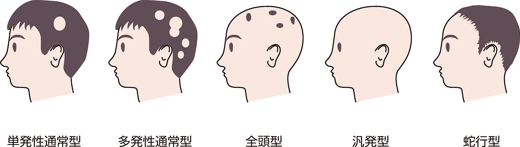 大部分は頭髪に境界がはっきりした脱毛斑(だつもうはん)が単発で出現し(単発性通常型)、数か月で自然治癒が期待できます。脱毛斑が多発する(多発性通常型)、頭髪全体が脱毛する(全頭型)、眉毛、ひげ、体毛にも脱毛が進行する(汎発型)、生え際が帯状に脱毛する(蛇行型)があり、これらの場合、治療に難渋することも多いです。一度、生え揃っても再度脱毛を繰り返すこともしばしば経験します。