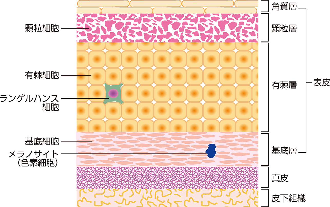 基底細胞がんは、高齢者の頭や顔面に発生しやすい皮膚悪性腫瘍(あくせいしゅよう)の1つです。ほかに腕や足、体に発生することもあります。皮膚は表皮と真皮(しんぴ)で構成され、その下層には皮下組織があります(図1)。