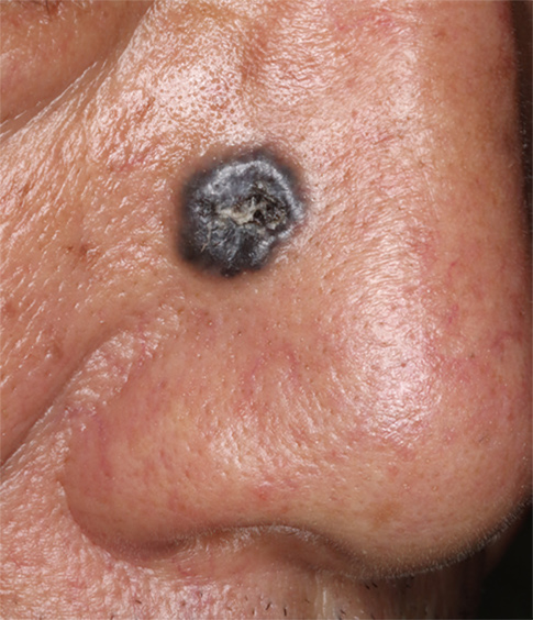 一般的に最も多いのは、黒色で蝋様光沢(ろうようこうたく)のある結節病変(結節型)で基底細胞がんの約80%を占めています(写真)。通常は痛みがないため、徐々に増大したり、表面に傷ができて出血したりしてから受診するケースが多いです。最近では、ほくろのがんは怖いというイメージが多くの患者さんの中にあり、顔に黒いできものができたことで早期に受診される方が増えたため、進行例は滅多に経験しません。