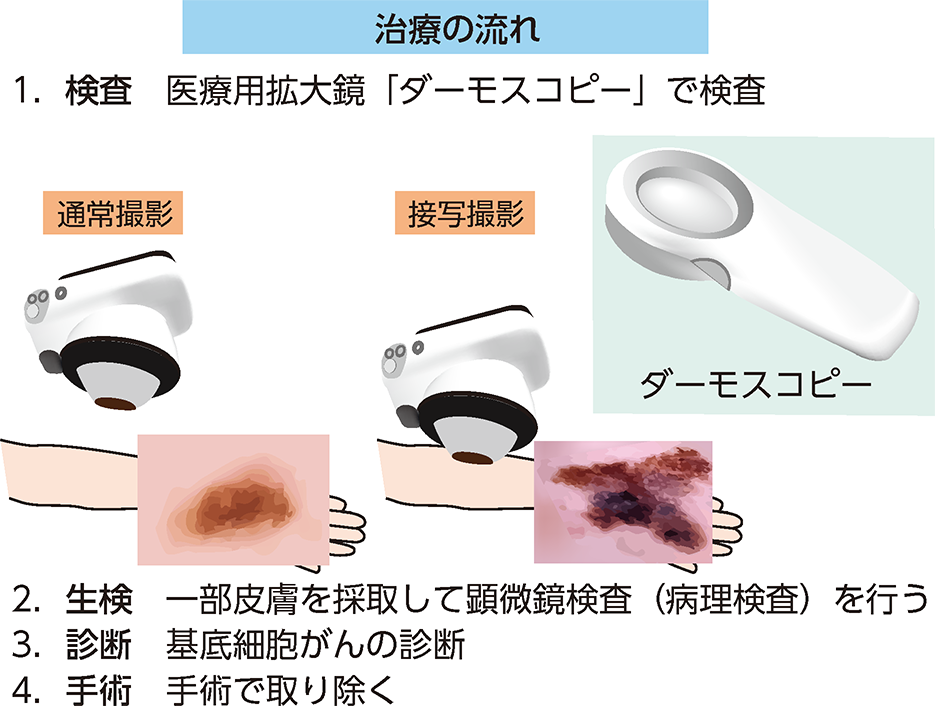 ダーモスコピーという特殊な拡大鏡を使用し、表面の色素や血管構造など、特徴的な所見から診断することができます。典型的なものであれば簡単に診断がつきますが、わかりにくいものは局所麻酔をして皮膚病変の一部を切り取り、顕微鏡でみる検査(病理組織学的検査)が必要になります。毛包と似たような組織構築を取るため、見た目がわかりにくいものでも病理診断は比較的容易です。
