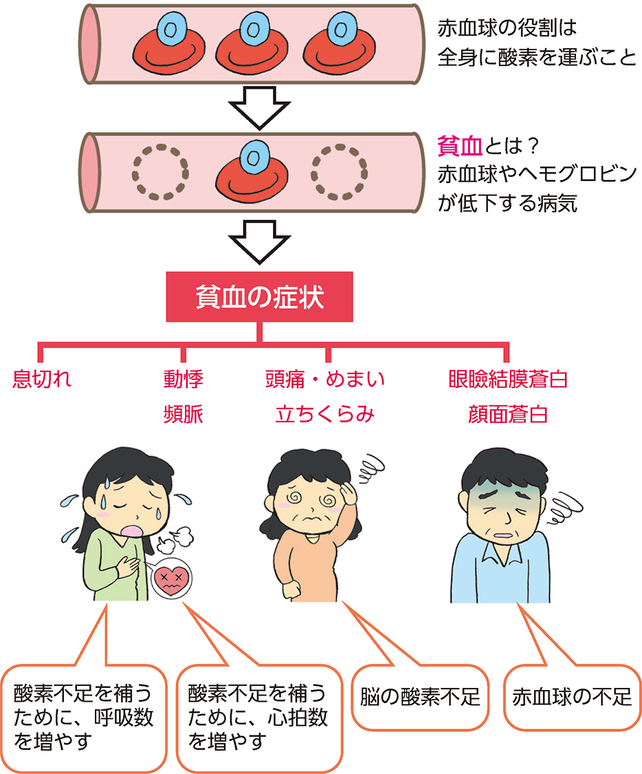 赤血球は酸素を全身に運ぶ役目を持っているので、貧血になると酸素の運び屋が少なくなり動悸(どうき)や息切れ、倦怠感(けんたいかん)などの症状がみられるようになります。