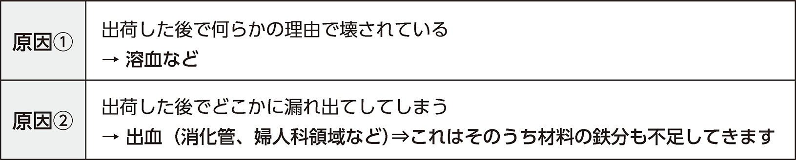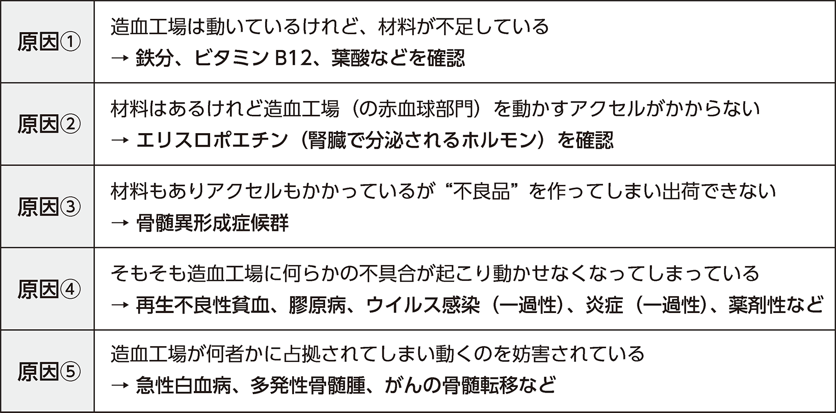 血液は「骨髄(こつずい)」という骨の中心部にある“造血工場”で作られ、体や手足をめぐる血管に供給 (いわば“出荷”) されています。私たちは貧血の患者さんを診たときに、まず「造血工場はちゃんと血液を出荷できているのか?」を考えます。もし出荷できていない場合は、なぜそのようなことになったのか原因を考えます。きちんと出荷できているなら、造血工場以外に問題があることになります。