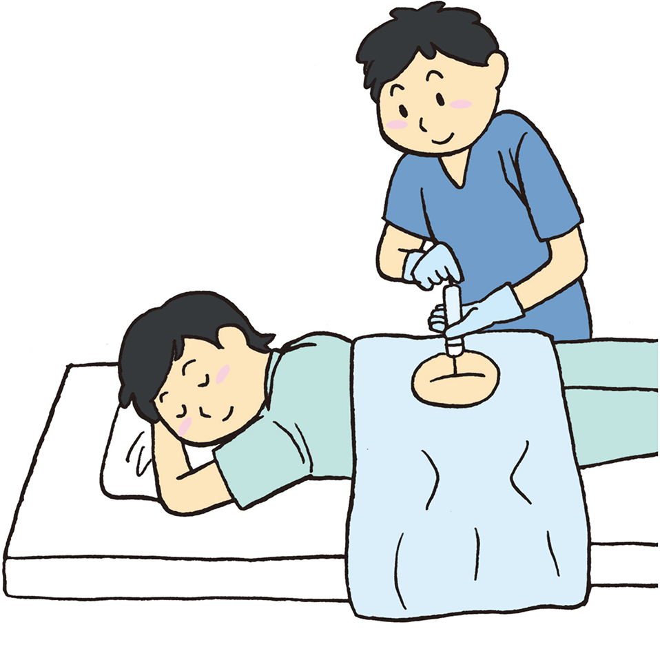 貧血の原因の中でも「表1の③~⑤」の理由を考えたときには、骨髄そのものを一部検査で採取する必要があります。うつ伏せ、または横向きに寝てもらい、骨盤の骨(腸骨)から局所麻酔をしたうえで、骨髄液や骨髄の組織を採取します(図2、胸の胸骨から採取する場合もありますが、骨盤が一般的です)。