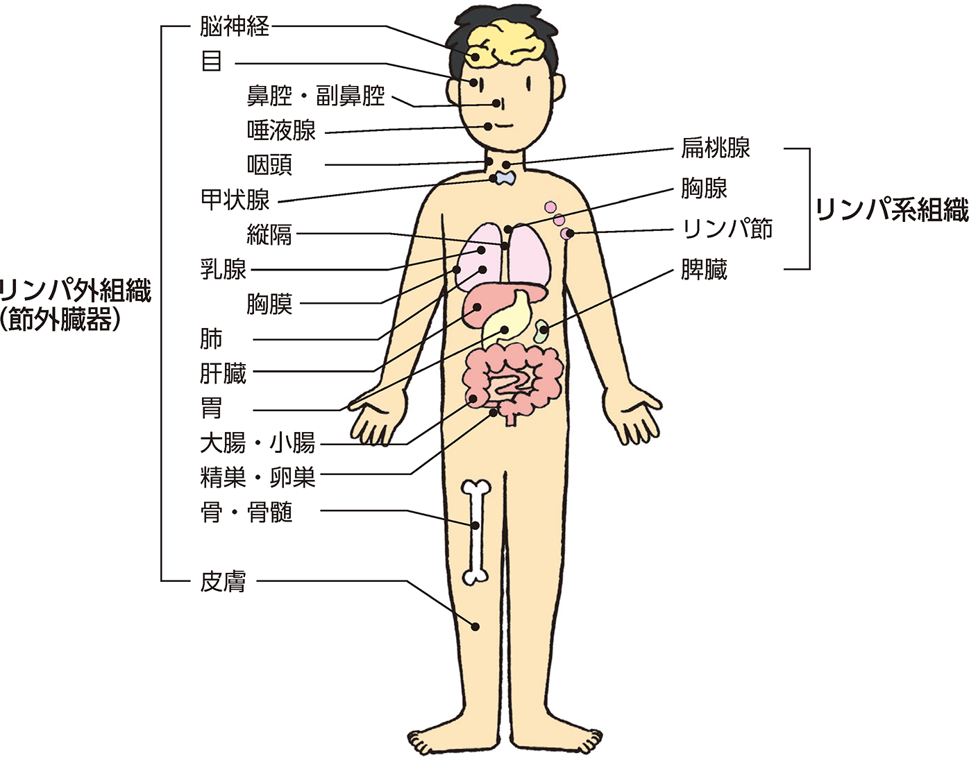 どの病型かを特定することが治療の方針にかかわるので、まずは病変の一部を検査や手術で採取し、しっかり診断をつける必要があります。典型的には、リンパ節が腫(は)れてきて気づかれることが多いですが、体中のどこからでも発生するため、臓器にしか発症していない場合などは診断が難しいこともあります(図)。