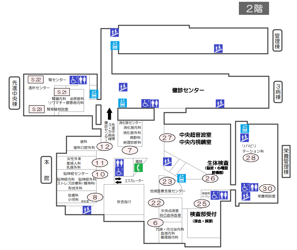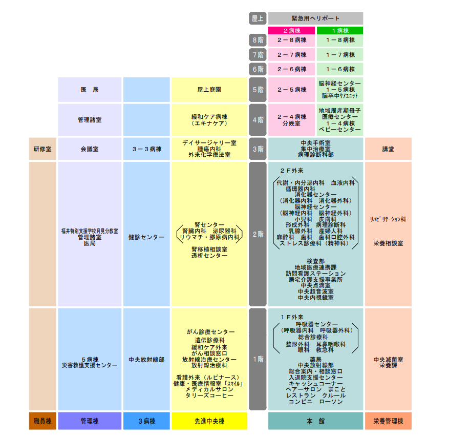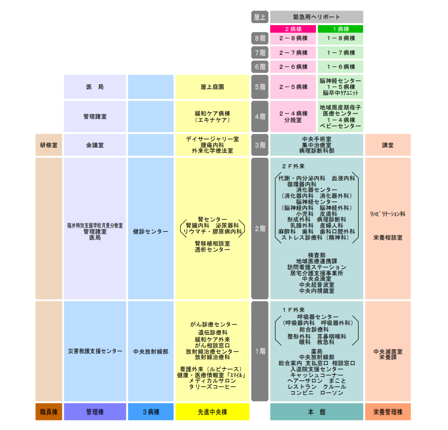 HOME > 病院案内 > フロアマップ フロアマップ 外来案内 1F 2F 病棟案内 理念・基本方針 院長挨拶 病院概要 幹部職員 沿革 診療報酬に関するお知らせ インフォームドコンセント プライバシーポリシー 臨床研究 臨床指標 2023年度(令和5年度) 2022年度(令和4年度) 2021年度(令和3年度) 病院情報の公表 日本医療機能評価機構 患者さんへのお願い 広報誌(ほやほや) 市民公開講座 患者さんからのご意見 よくあるご質問 交通アクセス フロアマップ 院内サービス 入札公示・業者登録 病院年報 100周年記念特設 創立100周年記念 福井赤十字病院まつり2025 図書室の利用(職員用)