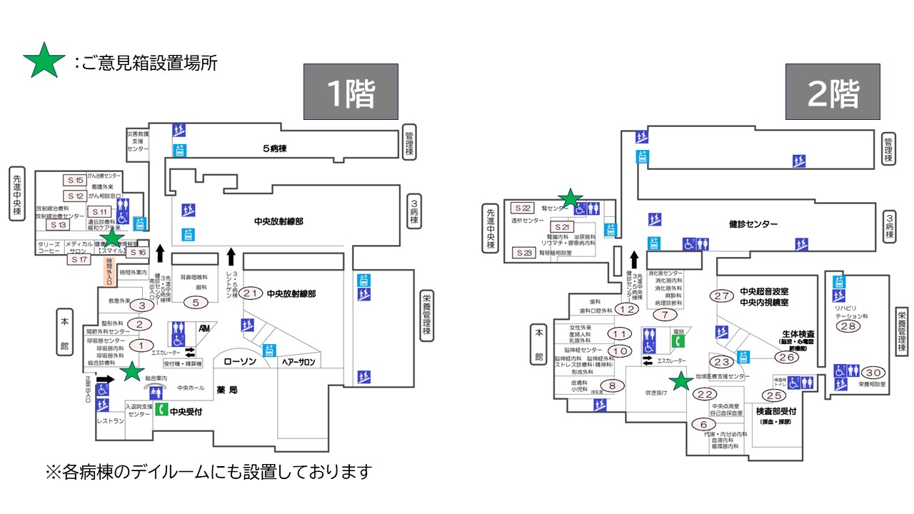 当院では、患者さんやご来院の方からご意見・ご要望などをお寄せいただくために院内各所にご意見箱を設置しております。いただいたご意見等は、関係部署に確認し、出来る限り改善につながるよう努めております。