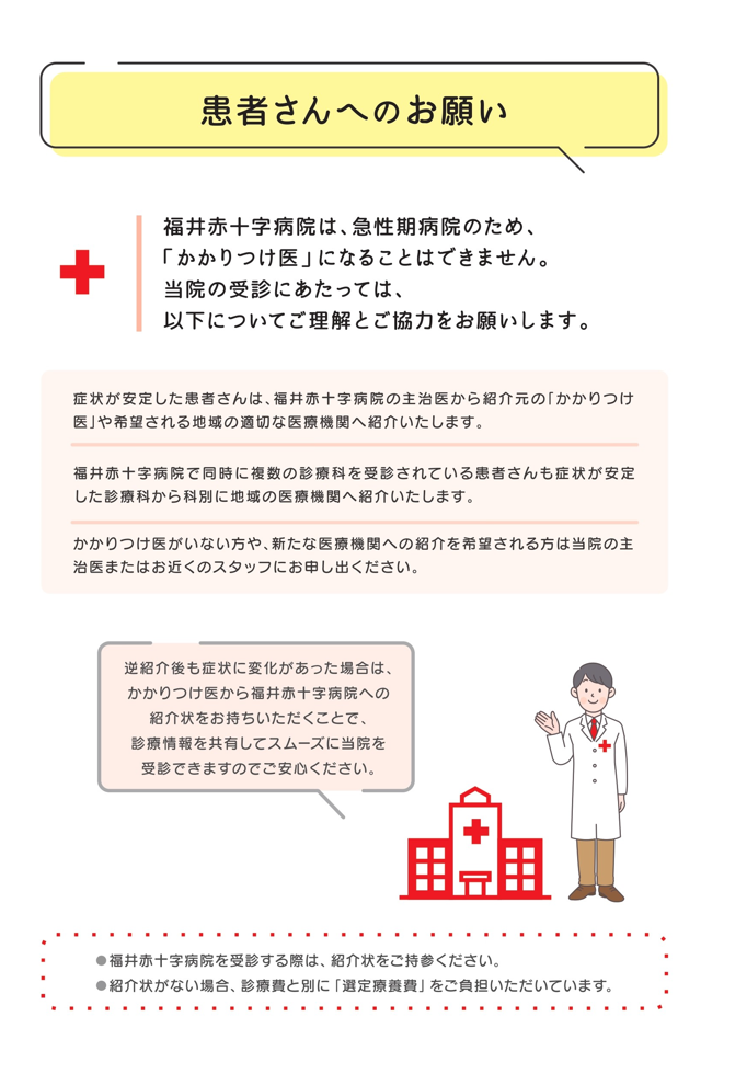福井赤十字病院は地域のかかりつけ医と連携して、当院の医師とかかりつけ医「ふたりの主治医」で皆様の治療に取り組んでいます。