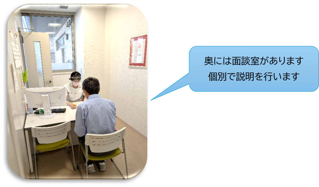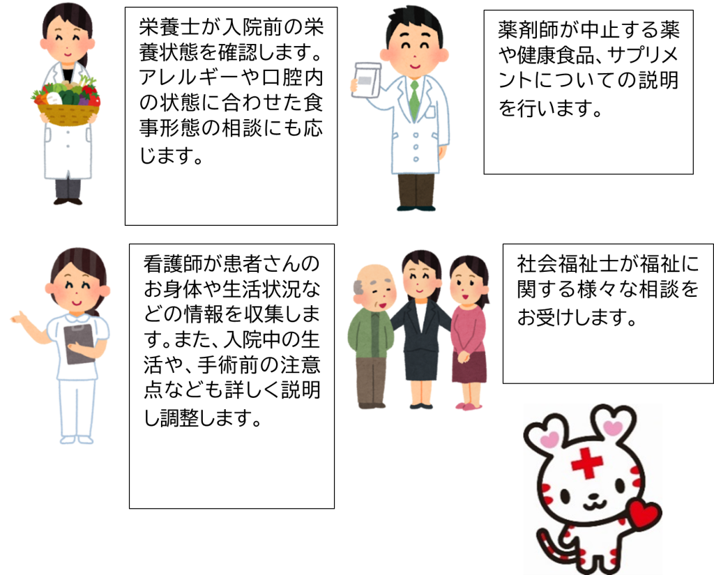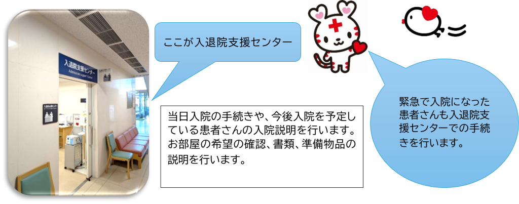 入退院支援センターでは、入院する予定の患者さんへの支援として、入院の手続きや入院時の書類の説明、入院後の生活についての説明を行っています。