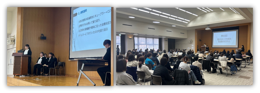 1月17日、第60回看護研究学会が 福井赤十字病院で開催されました。この学会は、看護部教育委員会が主催となり毎年行われています。今回は、7つの演題発表と5題のケーススタディ発表がありました。演題発表では、日々の看護実践の中で感じる疑問や課題などから、研究として年間通して取り組んできた成果を発表されました。様々な尺度や統計処理を行い、日々の成果を可視化することで看護を振り返る貴重な機会となりました。