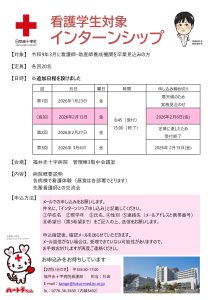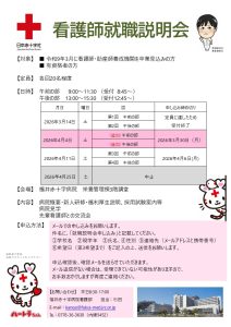 【内容】 病院概要・新人研修・福利厚生説明、採用試験案内等、 病院見学、先輩看護師との交流会
